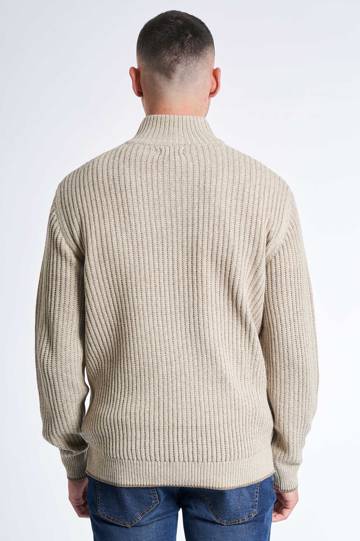 Opgrader din garderobe med vores stilrene Half Zip Strik "Tureby". Den ribstrikkede struktur og den høje krave med lynlås giver et moderne og maskulint udtryk, som både fungerer til hverdag og mere afslappede anledninger.